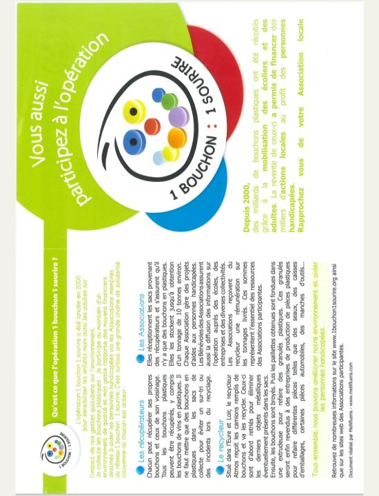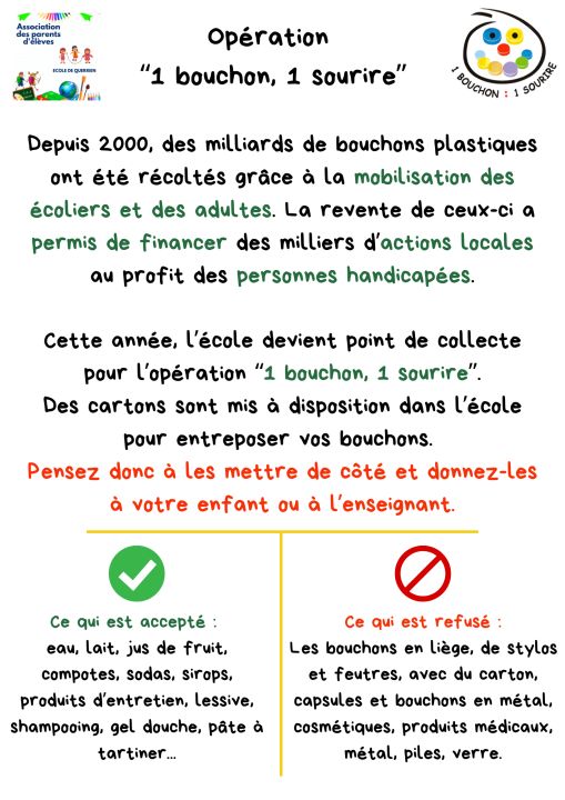 L'APE adhère à l'opération"1 bouchon, 1 sourire" en se proposant point de collecte.